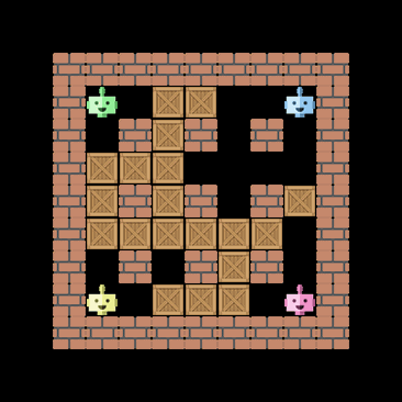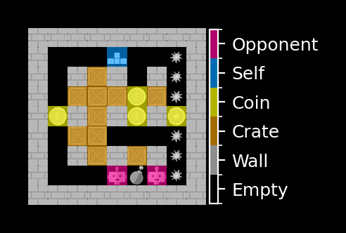 In Tic-Tac-Toe, Deep Q-learning was straightforward: I simply fed the \(9\) input fields into a fully connected layer of a neural network, without worrying about feature design. We could take a similar approach in BombeRLe. The board is larger - \(9\times9=81\) fields in the small version I’ll keep using - but that’s the only real difference. We could label each input state (empty, wall, crate, player, coin, bomb, etc.) and feed those directly into the network. Figure 1 illustrates such an encoding. However, it will probably lead to suboptimal performance as the neural network would need to learn to interpret categorical cell types from continuous numerical inputs.
