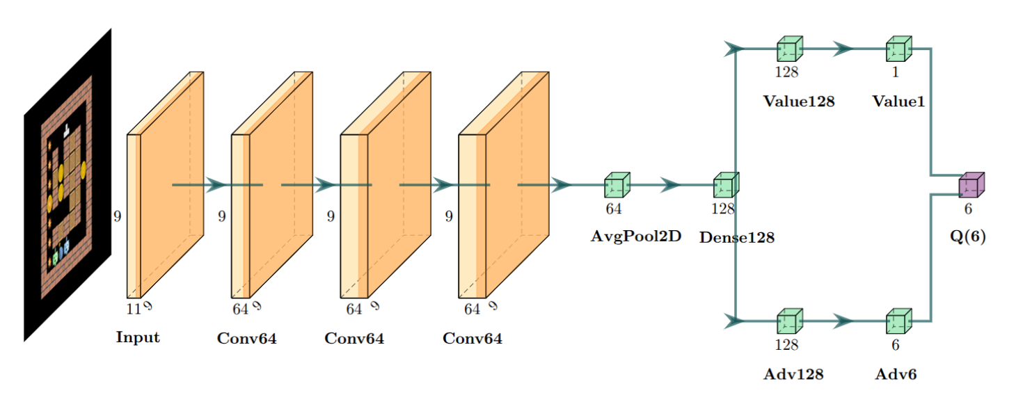 Figure 3 illustrates the neural network architecture I use in the following. The model is built from a stack of convolutional layers, followed by a pooling layer and a duelling head with fully connected layers. The pooling layer averages the spatial output of the last convolutional layer, reducing it to 64 values that serve as high-level features.