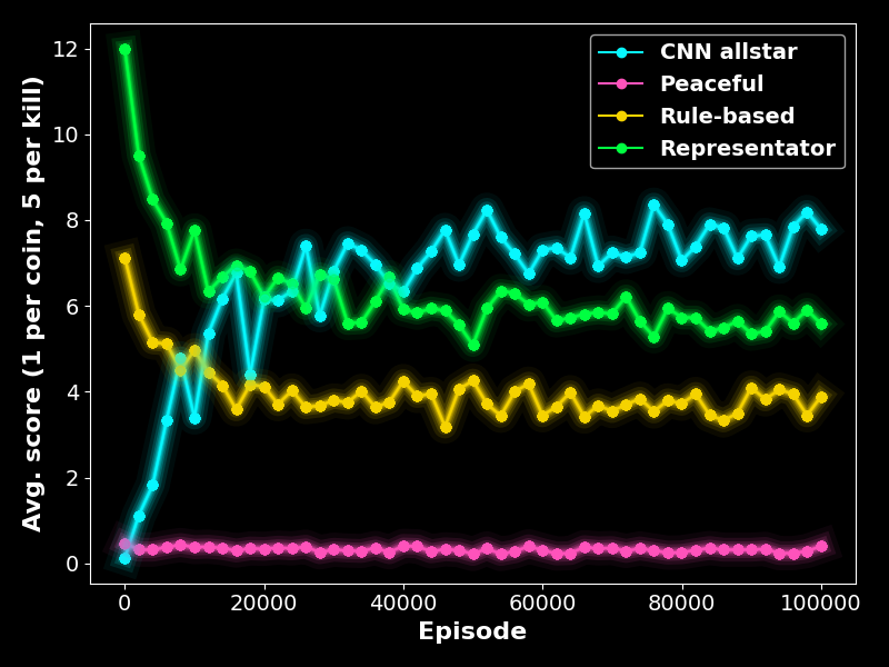 Next, we assess the performance of the cnn_allstar by studying the averaged results of 1,000 games between the cnn_allstar agent, a rule-based agent, the tabular-Q allstar agent (allstar) from the previous post and the representator.