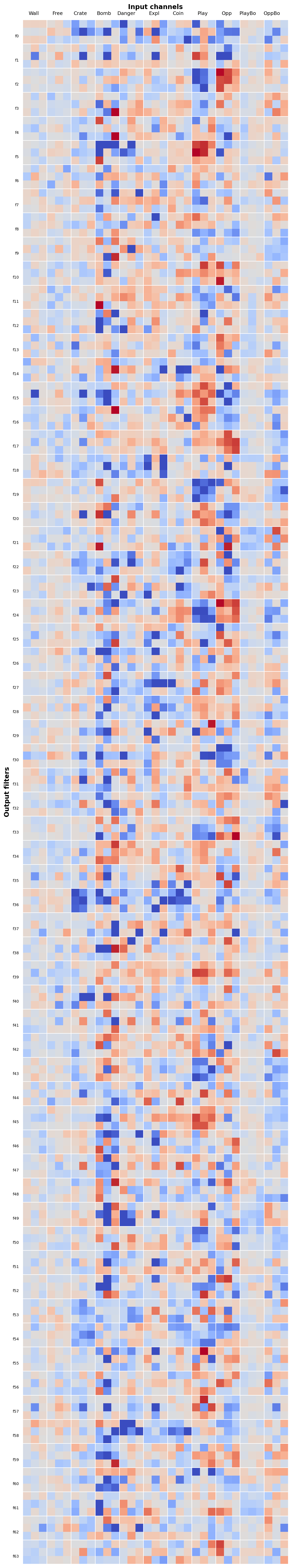 One thing I’ve been curious about is whether we can actually see the high-level features the convolutional layers are pulling out of the one-hot encoded data. As a first step, I plotted the weights of the cnn_allstar’s first convolutional layer’s filters (ignoring biases) after 100,000 episodes of training - shown in Figure 7. The first convolutional layer takes 11 input channels and has 64 filters with 3x3 heads giving a total of 6336 parameters shown here. We can clearly see that the parameters processing crate, bomb, player and opponent channels have the highest magnitudes. We can speculate about the interpretation of some of these filters: